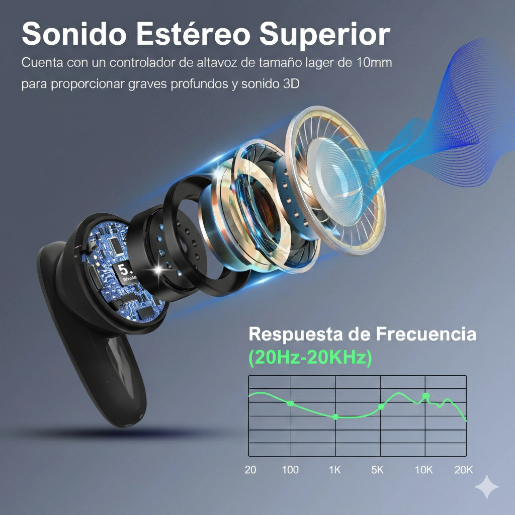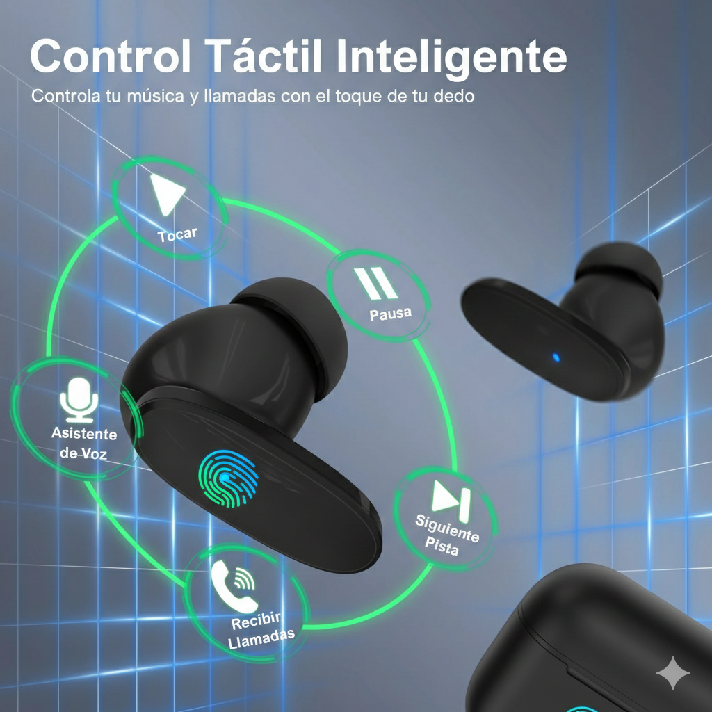 Auriculares inalámbricos Bluetooth 5.3 con diseño moderno y luces LED que iluminan tu experiencia auditiva. Ofrecen hasta 21 horas de reproducción total, controles táctiles inteligentes y un ajuste cómodo tipo in-ear. Ideales para entrenamientos, uso diario y sesiones nocturnas gracias a su estilo y ligereza.